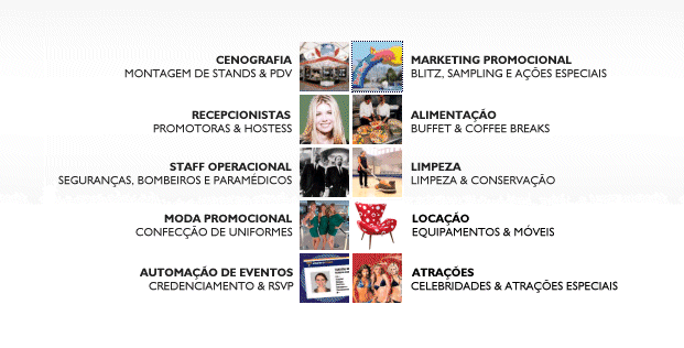 Cenografia - Montagem de Stands & PDV Recepcionistas, Promotoras & Hostess Segurancas, bombeiros e paramedicos Moda Promocional - Confeccao de Uniformes Automacao de Eventos - Credenciamento e RSVP Marketing Promocional - Blitz, Sampling e Acoes Especiais Alimentacao - Buffet & Coffee Breaks Limpeza & Conservacao Locacao de Equipamentos e Moveis Celebridades e Atracoes Especiais